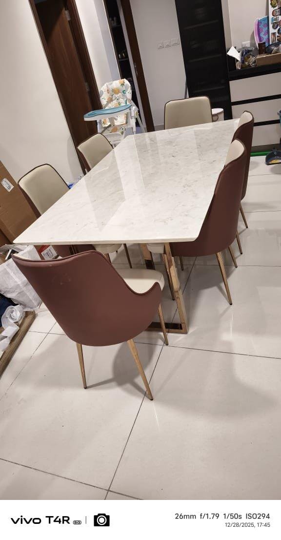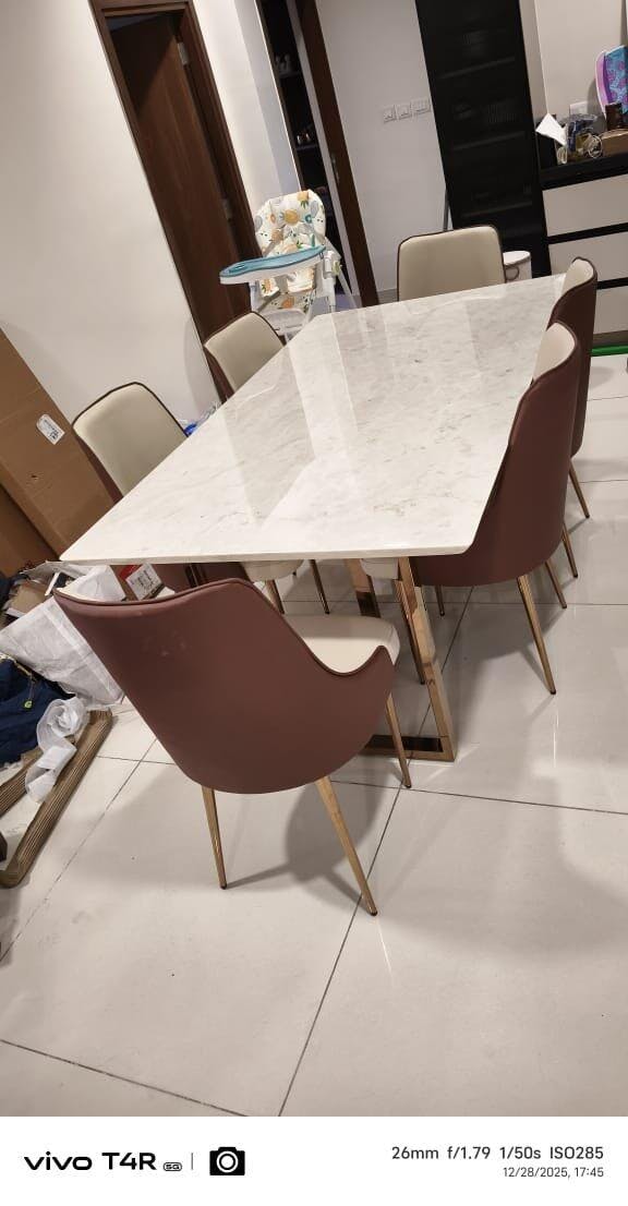 Design: Modern dining table with a T-shaped stainless steel base (SS 304, heat resistant and rustproof) with a PVD coating (physical vapour deposition—a lifelong rustproof coating) and a customisable natural stone top with chamfered edges and rounded corners (to prevent accidental bruises).