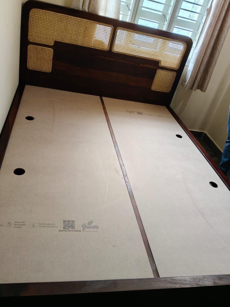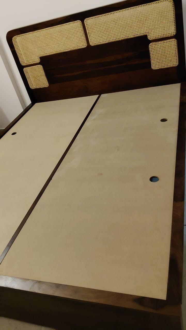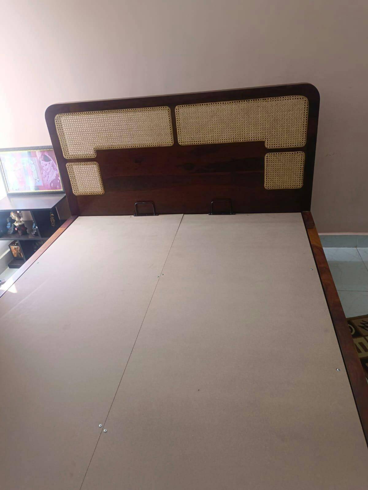 The bed looks absolutely stunning with its unique and modern headboard design! The blend of dark wood and woven cane panels adds a beautiful, classy touch to the room. The craftsmanship is clean, stylish, and gives the setup a premium feel. Truly a perfect mix of elegance and contemporary design.