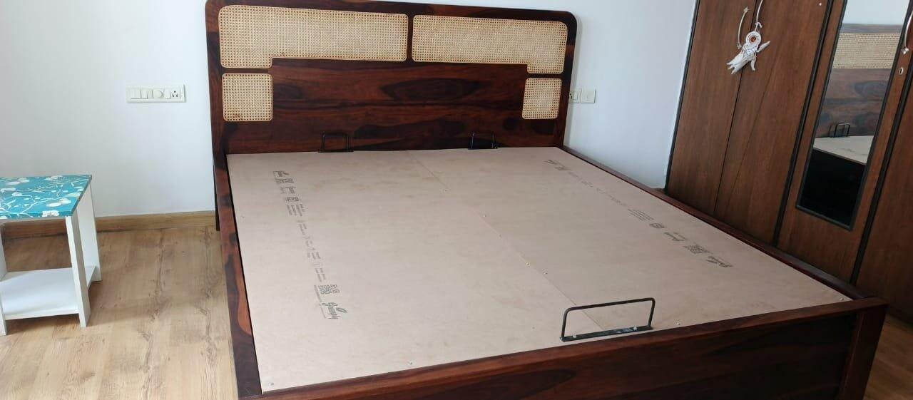 This king-size wooden bed with hydraulic storage offers a premium, stylish presence with its finely crafted wooden frame and elegant rattan headboard. The clean, modern finish elevates the bedroom’s aesthetic, adding warmth and a touch of refined sophistication to the entire space.