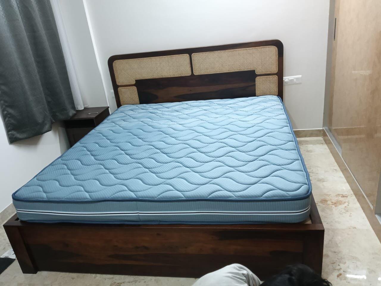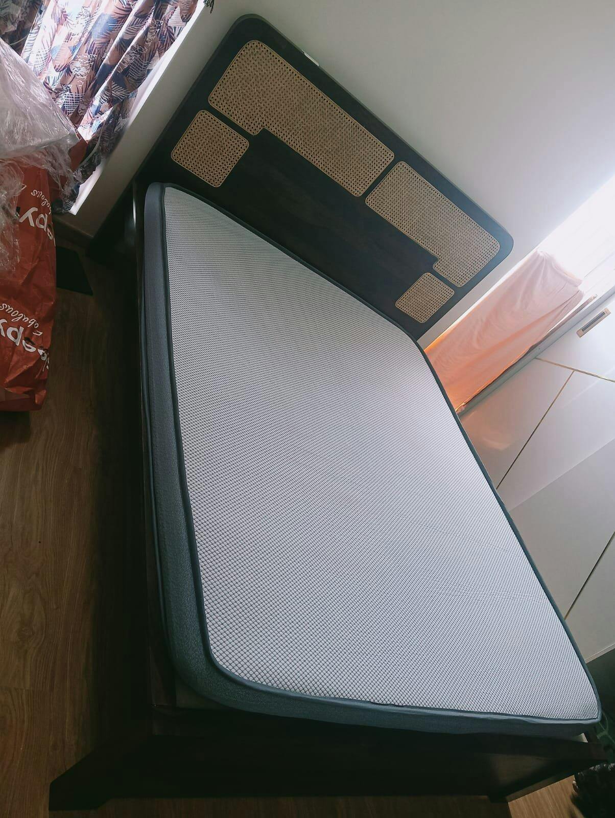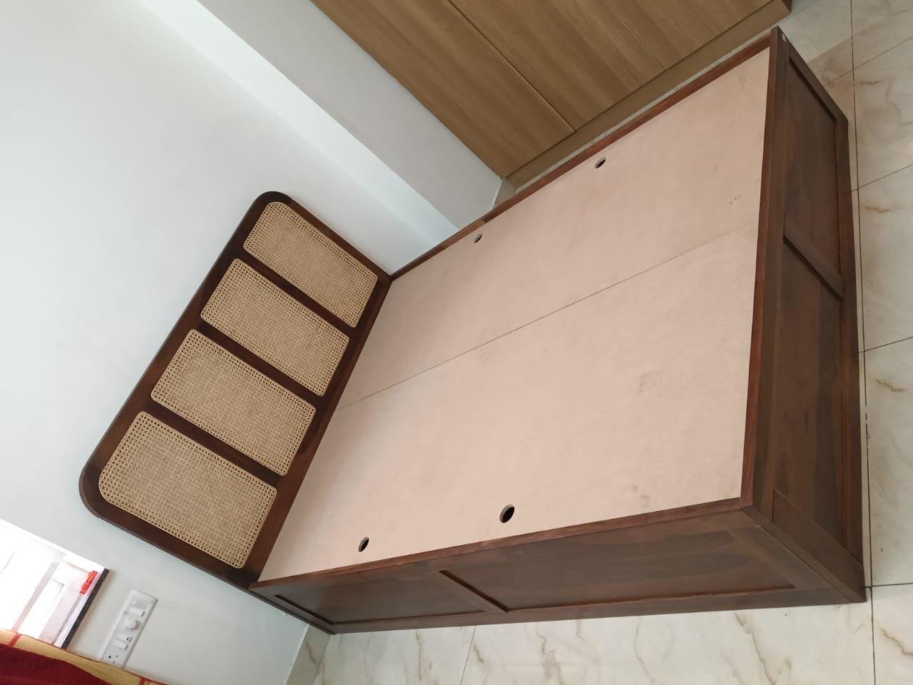 The queen-size wooden bed exudes a stylish and premium vibe with its beautifully crafted wooden frame and elegant rattan headboard. Its clean, modern finish elevates the bedroom’s aesthetic, adding a warm and sophisticated charm to the space.