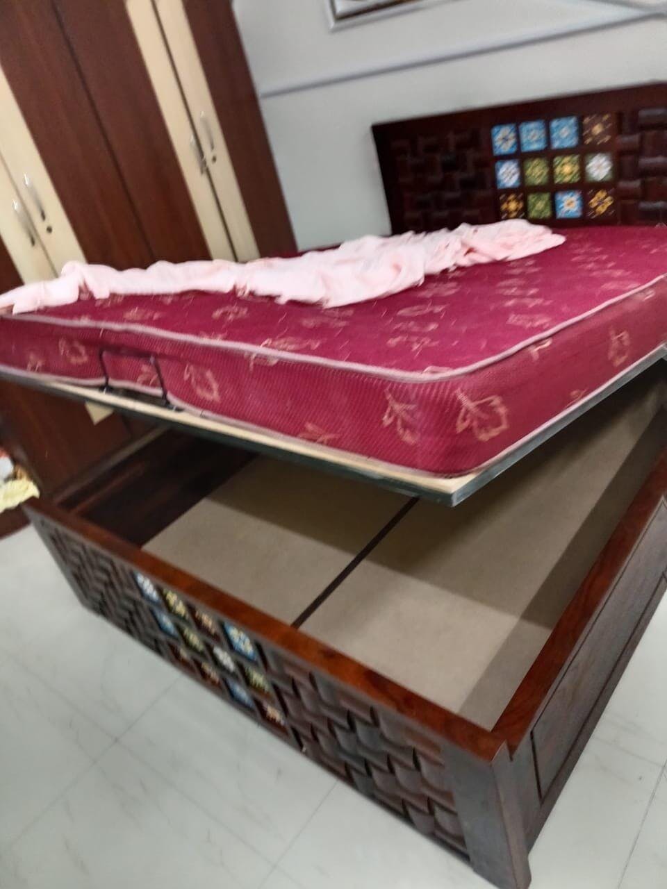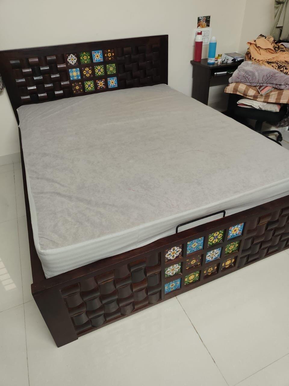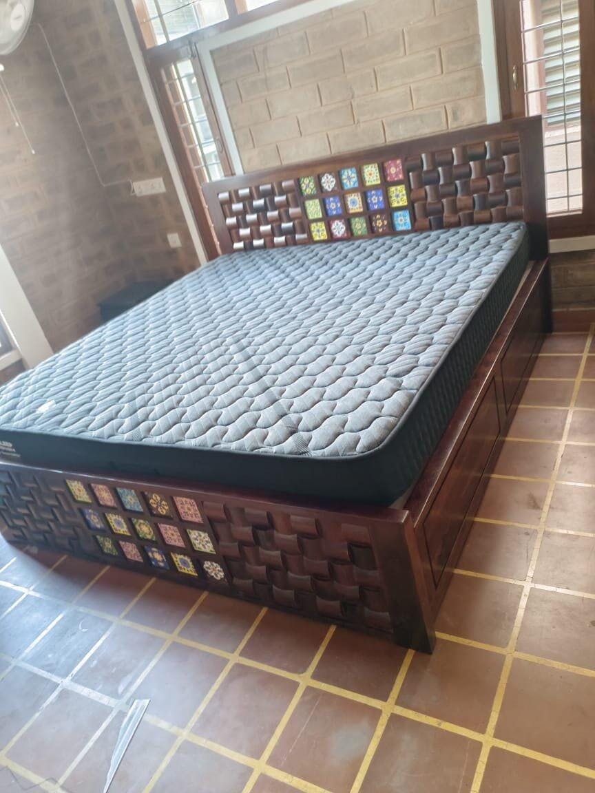 The bed looks absolutely stunning! The unique woven wooden design combined with the colorful ceramic tiles adds a beautiful artistic touch to the room. The craftsmanship is impressive, and the mattress fits perfectly, giving the whole setup a premium and stylish look. Truly a standout piece that enhances the entire space.