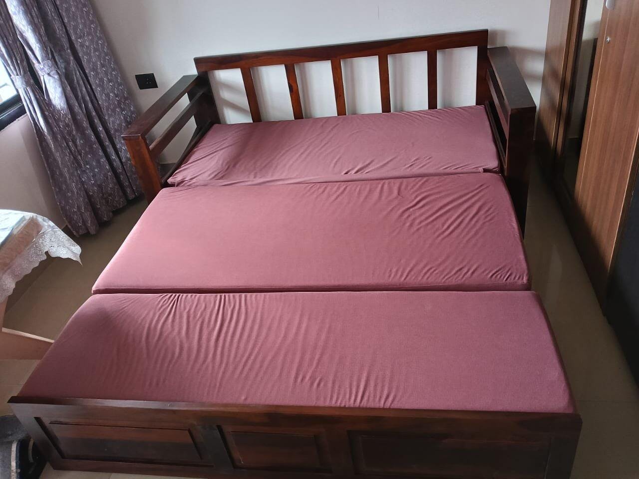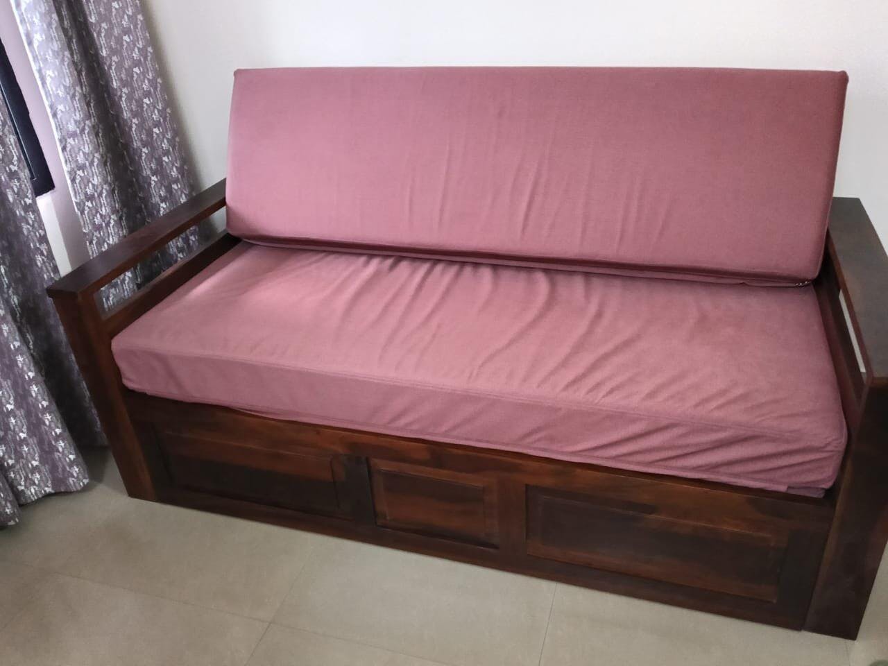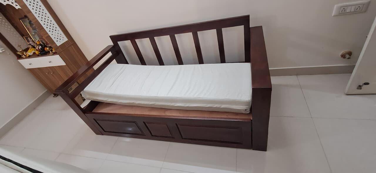 This sofa cum bed combines classic elegance with a smart, space-saving design. Crafted from sturdy wood and finished with a smooth polish, it delivers lasting comfort and versatility—ideal for modern compact spaces.