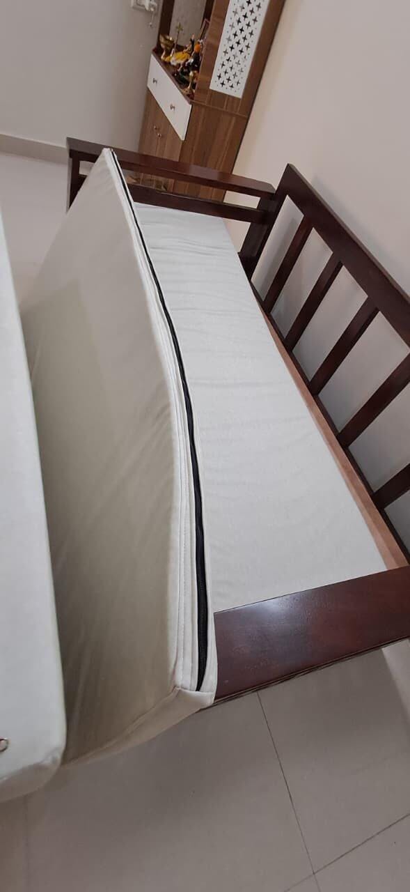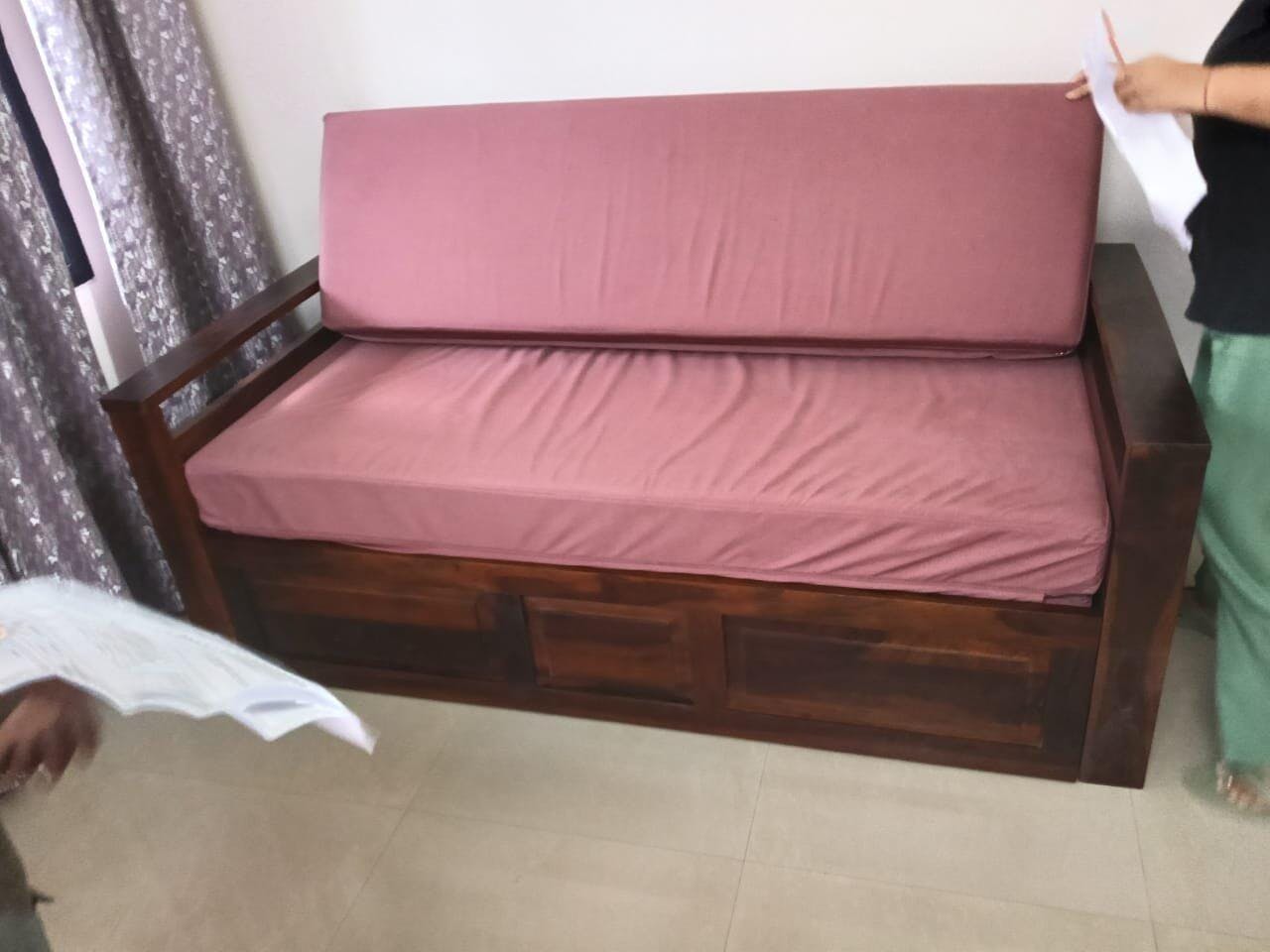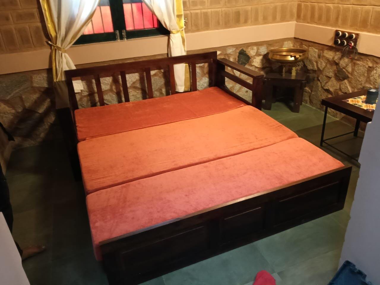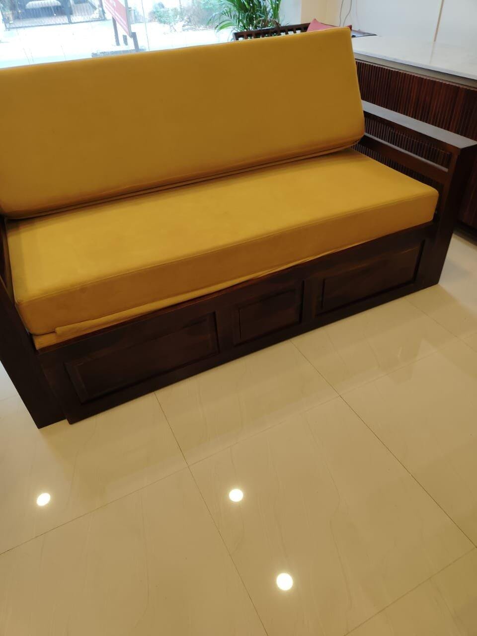 This sofa cum bed combines classic elegance with a smart, space-saving design. Crafted from sturdy wood and finished with a smooth polish, it delivers lasting comfort and versatility—ideal for modern compact spaces.