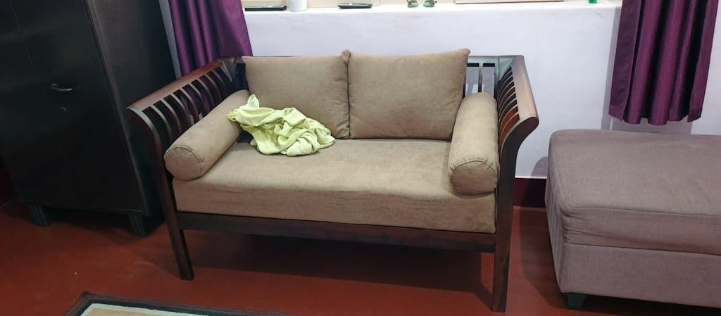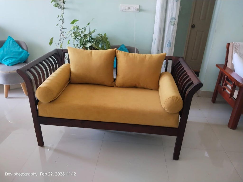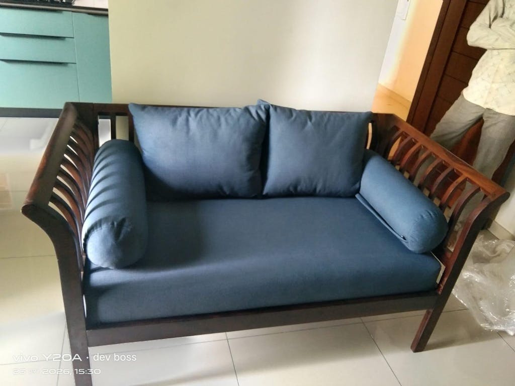 The Garud 2 Seater sofa, crafted from Sheesham wood, features an airy, slatted frame for breathability. Available in 1-seater, 2-seater, and 3-seater options with 50+ fabric choices.