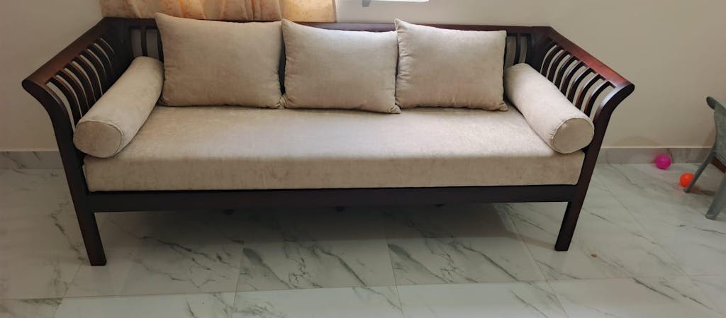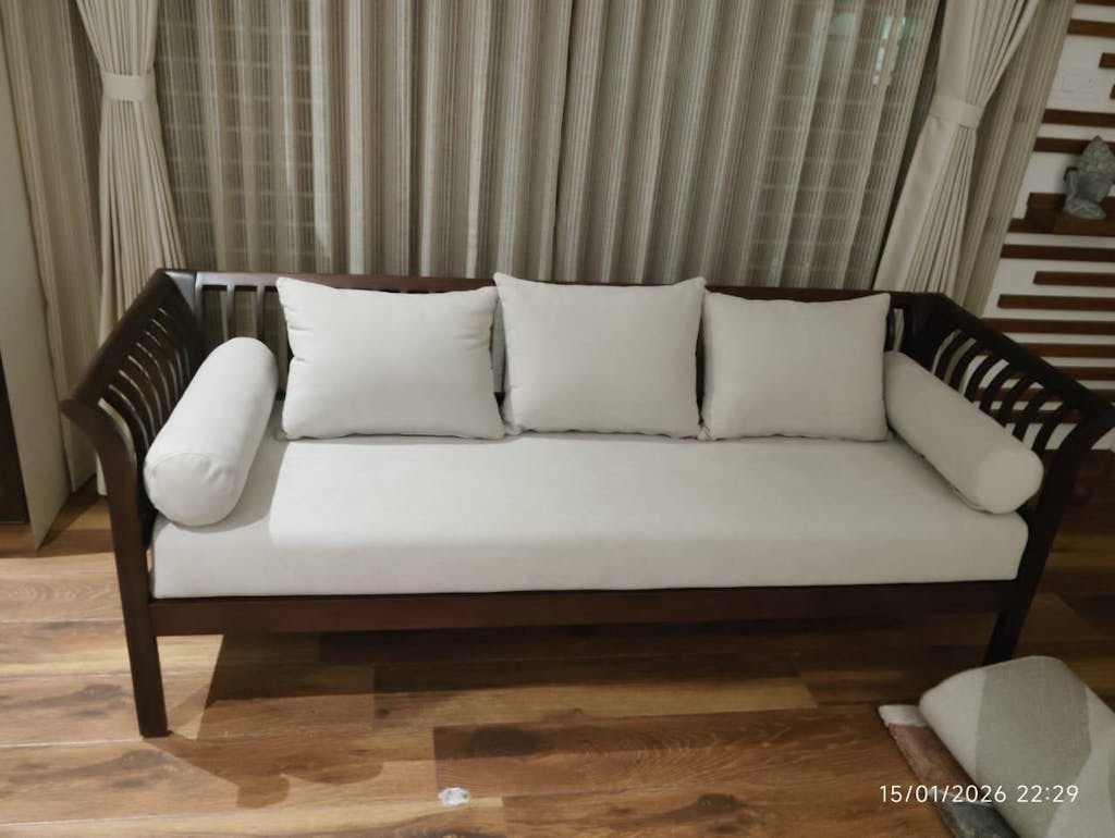 The Garud 3 Seater sofa, crafted from Sheesham wood, features an airy, slatted frame for breathability. Available in 1-seater, 2-seater, and 3-seater options with 50+ fabric choices.