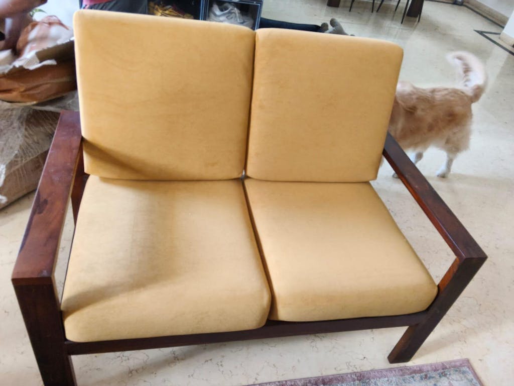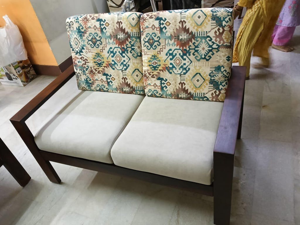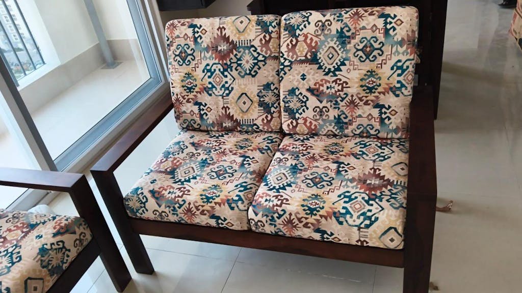 • Design: Minimalistic wooden frame with clean lines, open armrests, and plush, removable cushioned seats