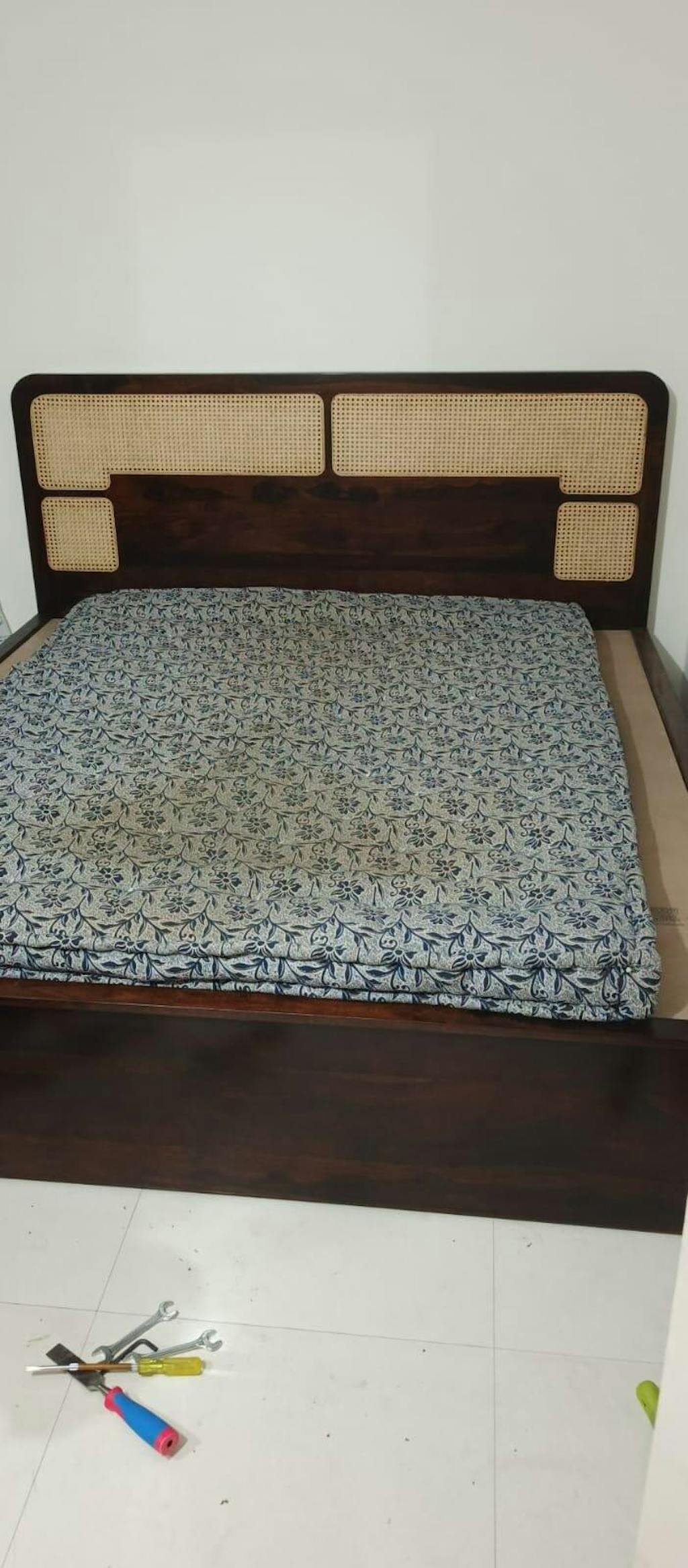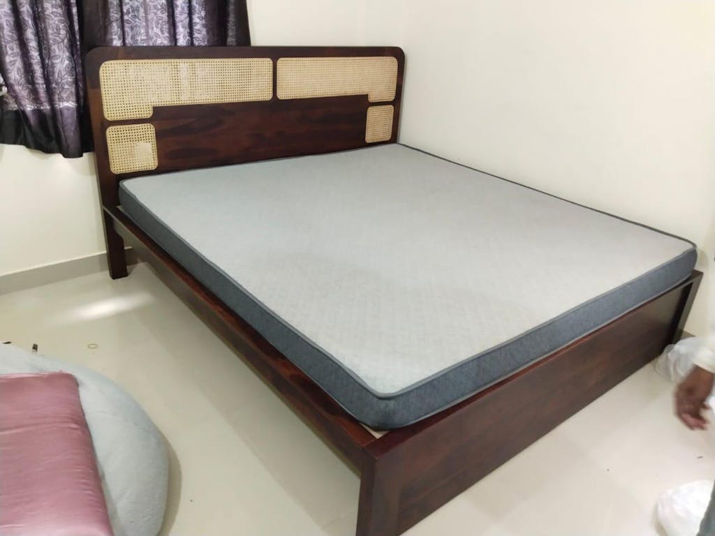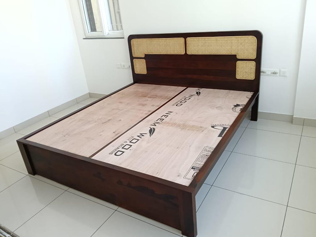 Design: Warm-toned Sheesham wood with rounded headboard edges and cane accents