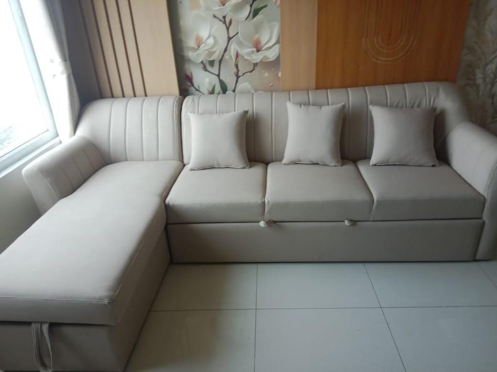 L-shaped sofas, two-seater sofas, and sofa-cum-beds are ideal for small apartments because they save space while providing functional and comfortable seating.
