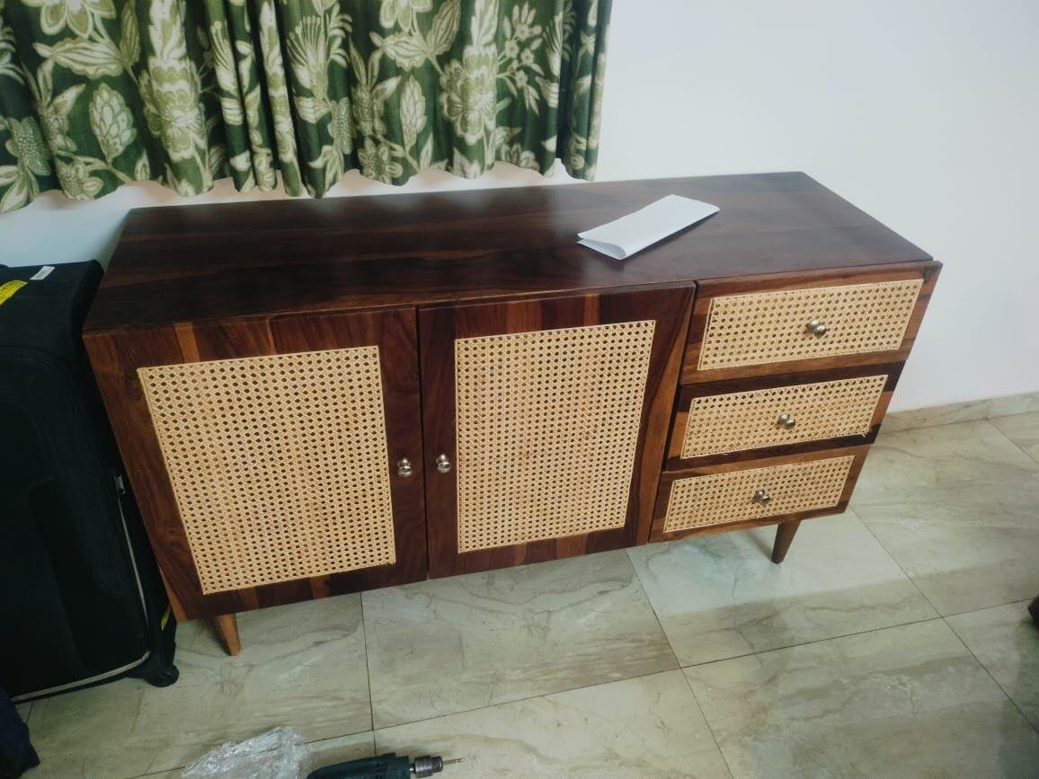 - Design : Sideboard with 2 shutters, 3 drawers, and rattan accents on the shutters and drawer facias.