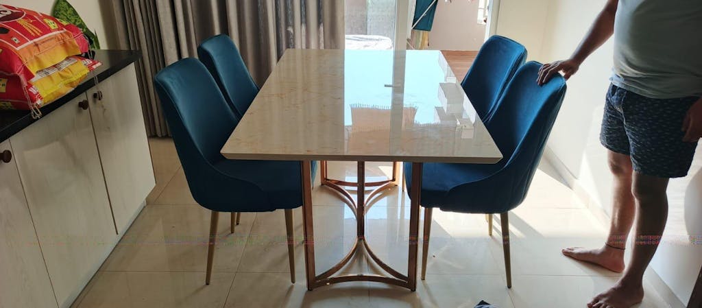 Design: Modern dining table with a sleek stainless steel base (SS 304, heat resistant and rust proof) with a PVD coating (Physical Vapour Deposition—a lifelong rustproof coating) and a customizable natural stone top with chamfered edges and rounded corners (to prevent accidental bruises).