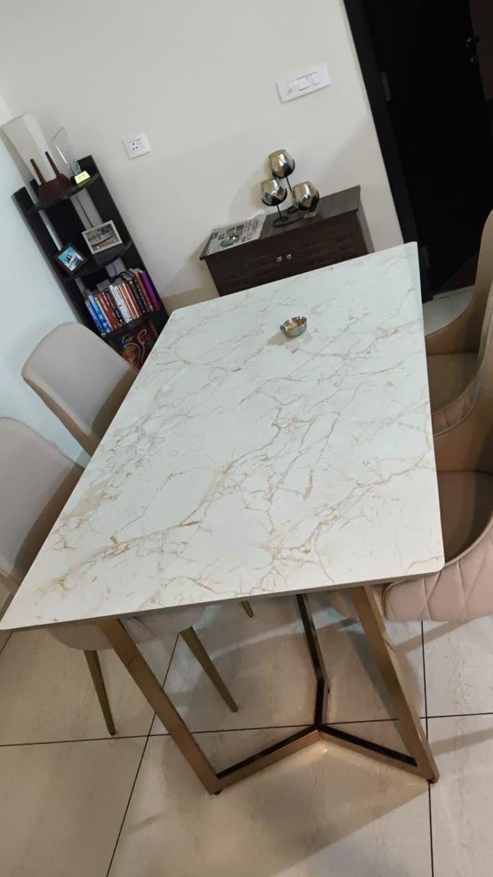 Design: Modern dining table with a sleek stainless steel base (SS 304, heat resistant and rust proof) with a PVD coating (Physical Vapour Deposition—a lifelong rustproof coating) and a customizable natural stone top with chamfered edges and rounded corners (to prevent accidental bruises).