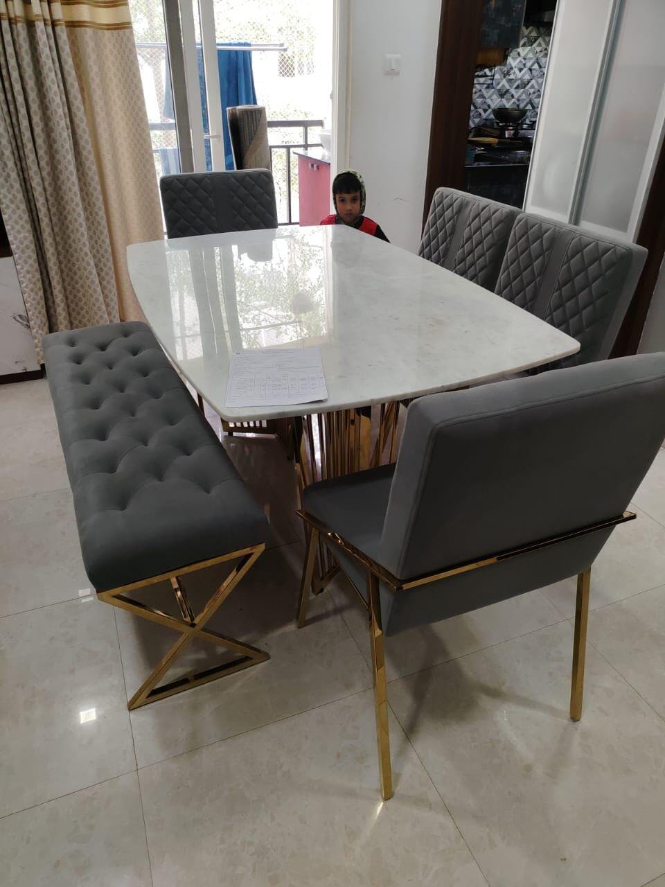 Design: Modern dining table with an architectural stainless steel base (SS 304, heat resistant and rust proof) with a PVD coating (Physical Vapour Deposition—a lifelong rustproof coating) and a customizable natural stone top with chamfered edges and rounded corners (to prevent accidental bruises).