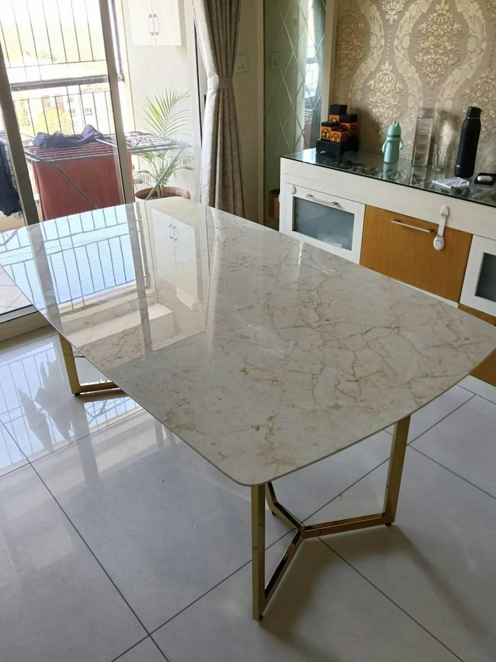 Design: Modern dining table with an architectural stainless steel base (SS 304, heat resistant and rust proof) with a PVD coating (Physical Vapour Deposition—a lifelong rustproof coating) and a customizable natural stone top with chamfered edges and rounded corners (to prevent accidental bruises).