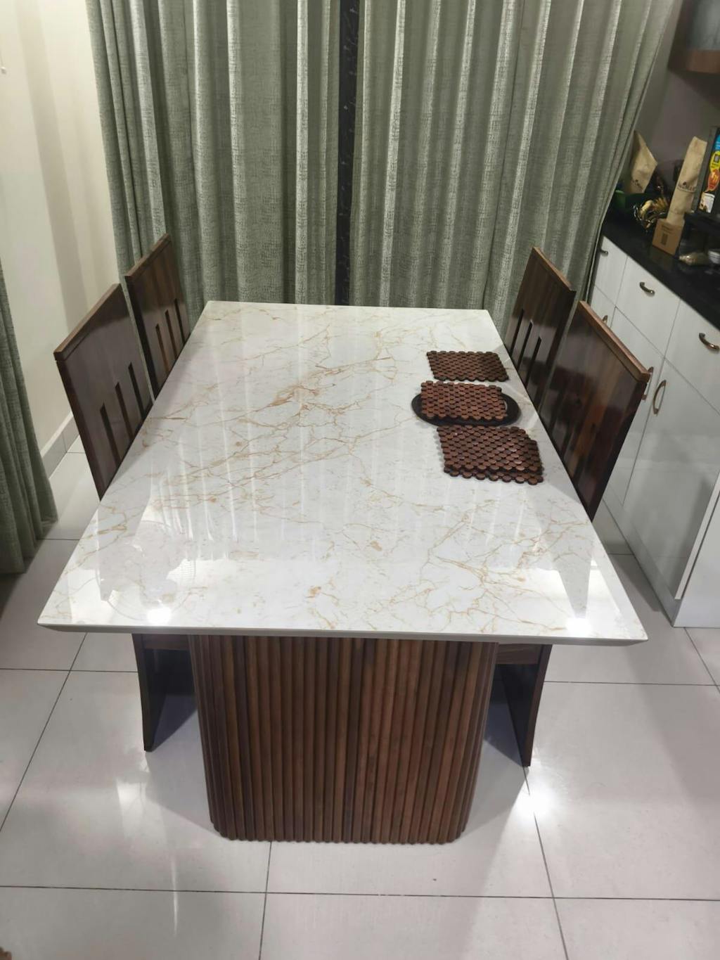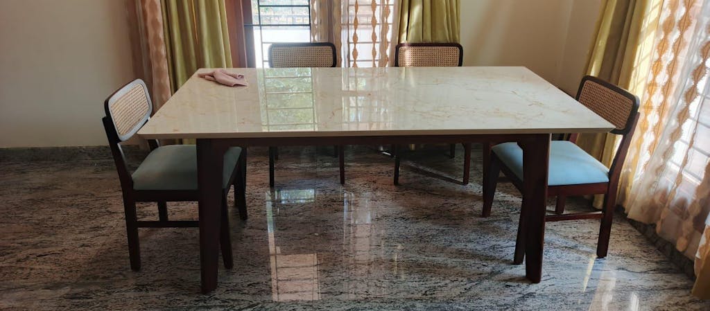 The Swaarno Travertine Dining Set is crafted with precision, featuring a handcrafted fluted mango wood base with a plywood underlay for stability and durability. Available in 4-seater and 6-seater options, it is designed to elevate your family gatherings.