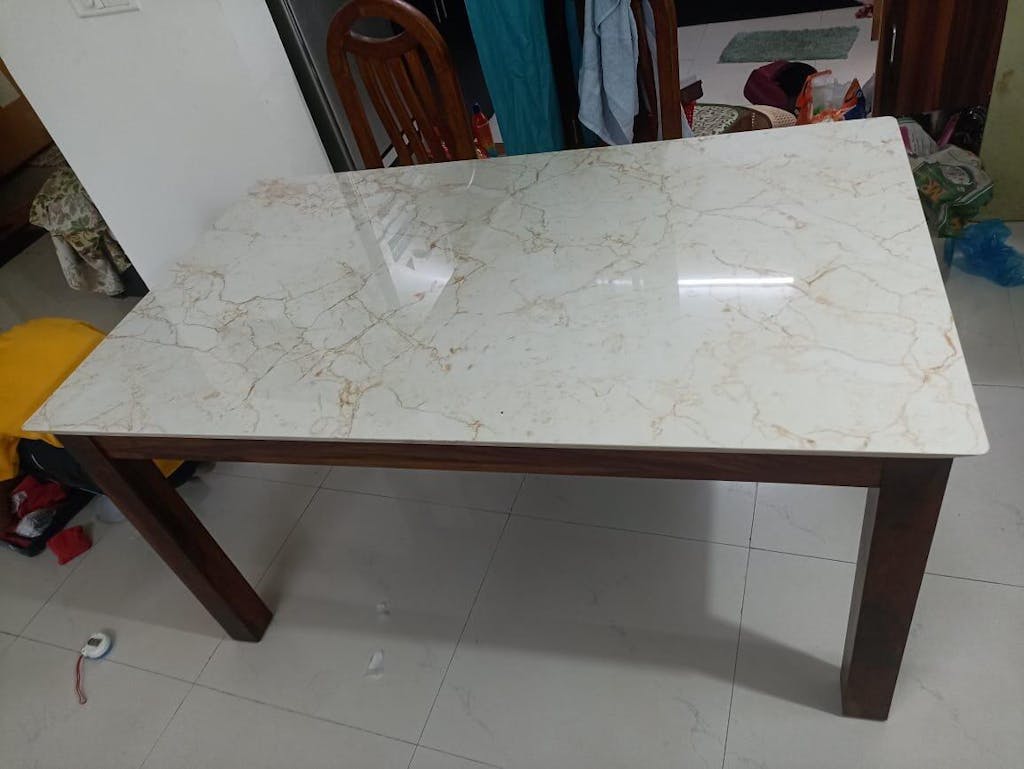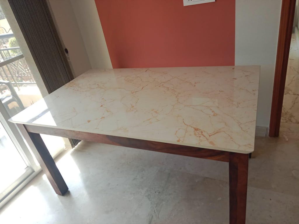 The Zhera Dining Table is crafted with precision, featuring a solid natural Sheesham wood base and an Indian marble top, available in 4-seater and 6-seater options, designed to elevate your dining experience.