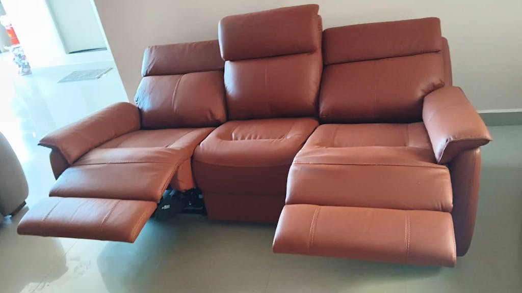 The Taurus Motorized Recliner, upholstered in top-grain leather, offers smooth reclining, firm lumbar support, and anti-sag construction. A plush backrest, curved armrests, and a tiered footrest ensure lasting comfort. USB port included. Available in 1, 2, and 3-seaters.