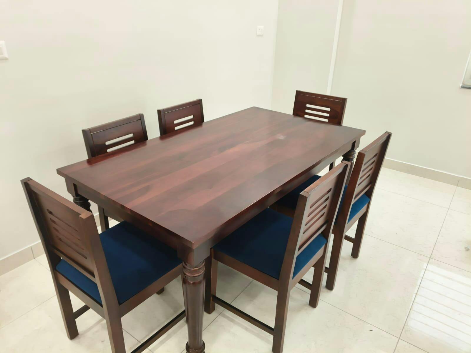 The Akira 6-Seater Dining Set is constructed from solid Sheesham wood, ensuring durability and structural integrity. The table features a sturdy frame with thick, straight legs for enhanced stability. Its smooth, polished surface is resistant to wear, while the CNC-cut chairs offer a breathable cushioned seat. The wood is treated for lifetime termite resistance, and a dual-coat polish further enhances longevity.