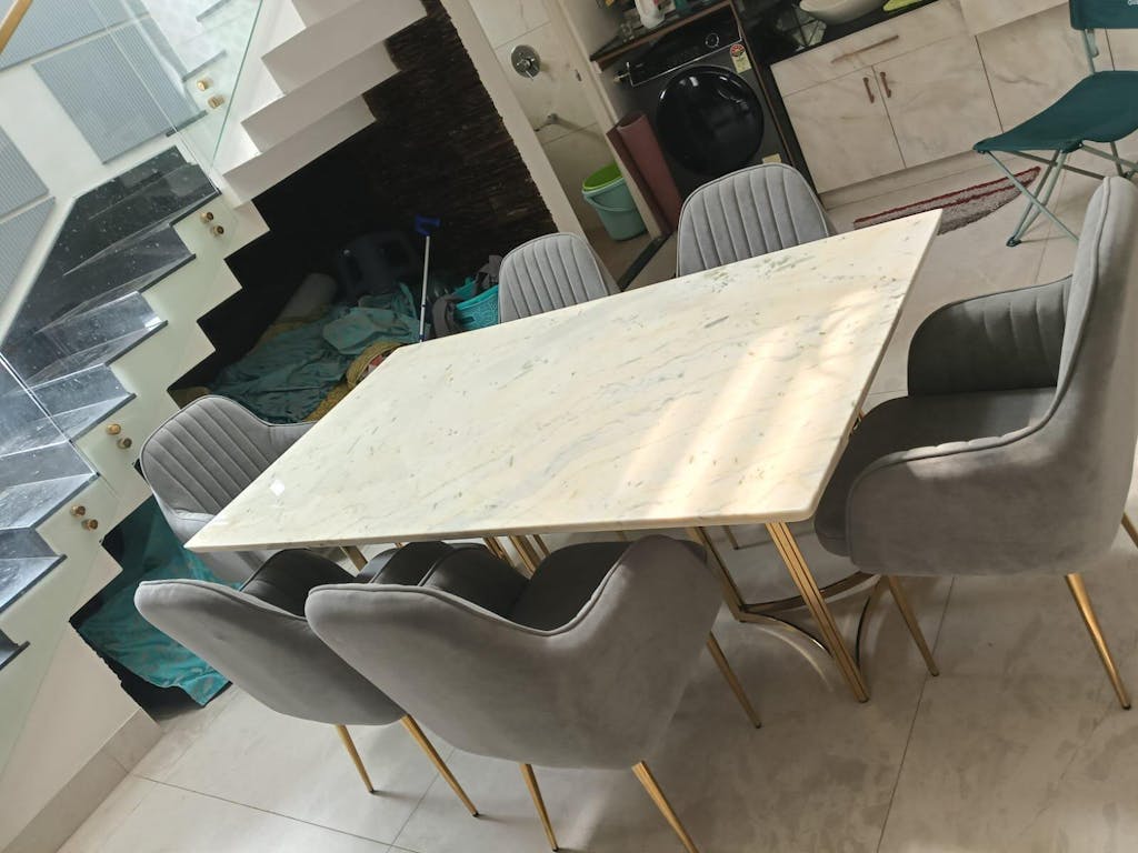 Design: Modern dining table with an architectural stainless steel base (SS 304, heat resistant and rust proof) with a PVD coating (Physical Vapour Deposition—a lifelong rustproof coating) and a customizable natural stone top with chamfered edges and rounded corners (to prevent accidental bruises).
