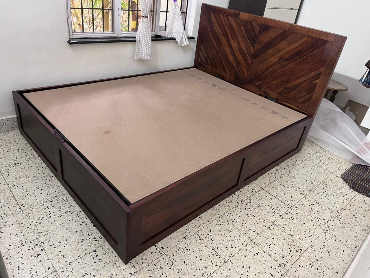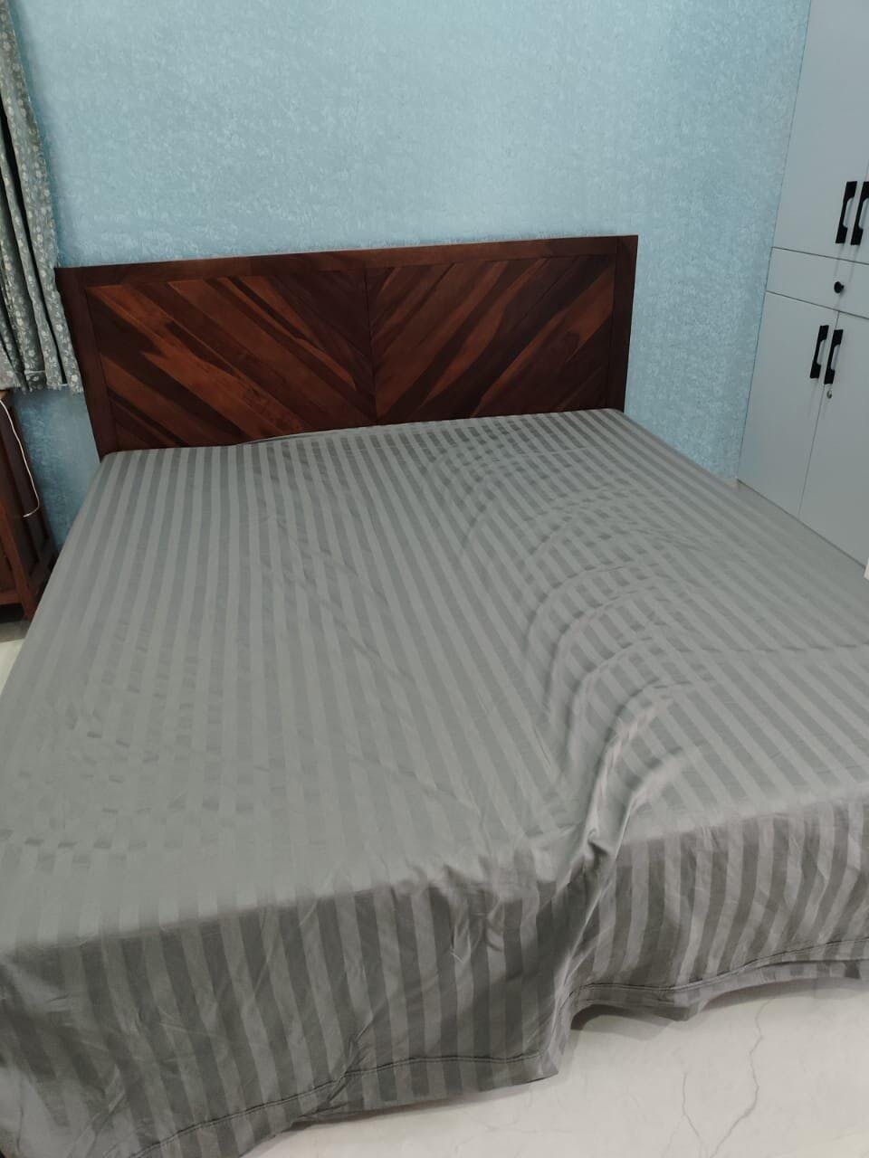 The bed looks absolutely elegant! The rich wooden headboard with its sleek chevron pattern adds a stylish, modern touch to the room. The setup looks clean, well-designed, and perfectly complements the light décor. A beautiful blend of simplicity and premium craftsmanship.