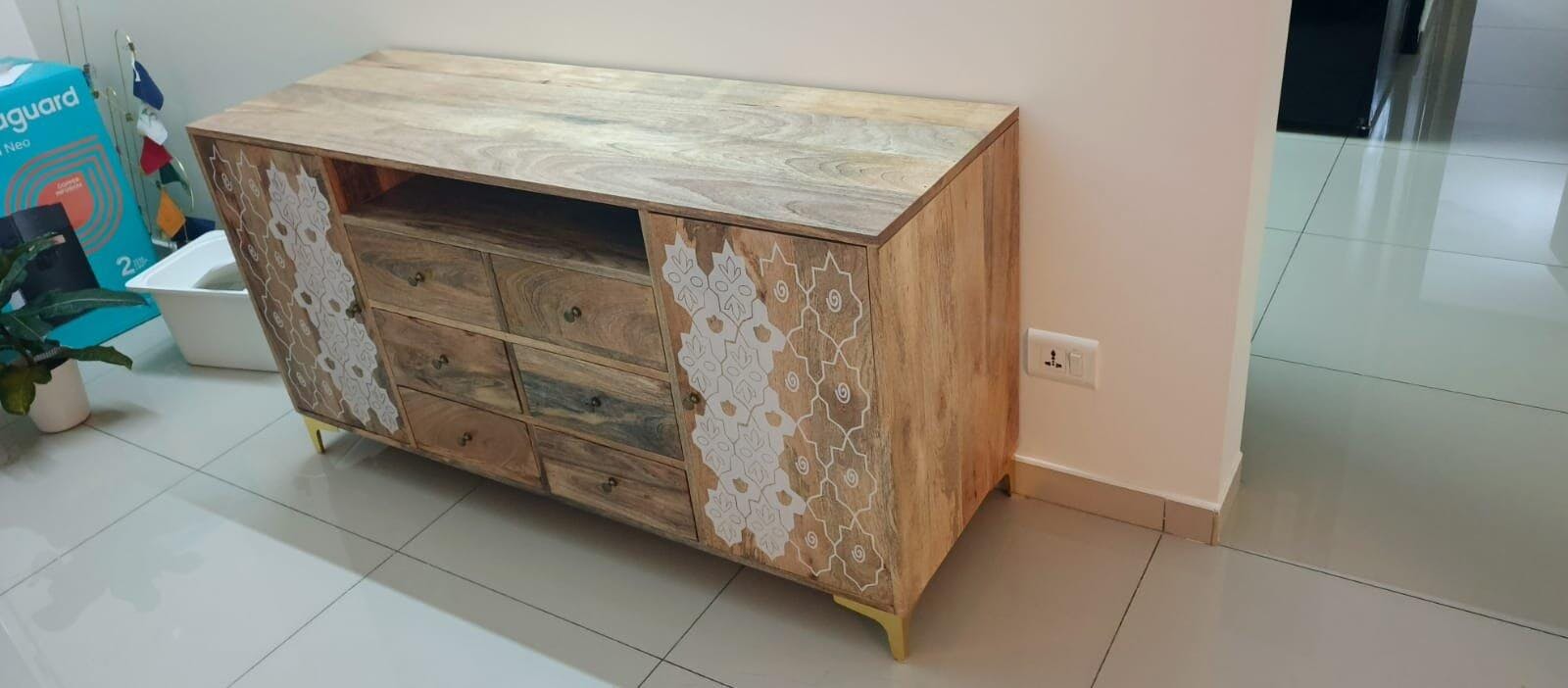 Hand-painted chest of drawers, featuring intricate white detailing on a natural wood finish. With six spacious drawers and a double-door cabinet, it combines artistic charm with practical storage. Perfect for adding a splash of color and a bohemian flair to your living room, bedroom, or hallway, this piece effortlessly blends function with style.