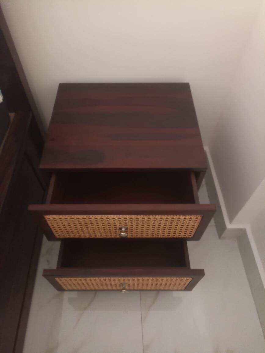 The Amara Bedside Table with Double Drawer is designed for both style and practicality. It has two spacious drawers, each featuring a cane accent that adds a modern touch without being see-through. Made from Sheesham wood, it shows off the natural grain and has a warm Natural Teak Finish.