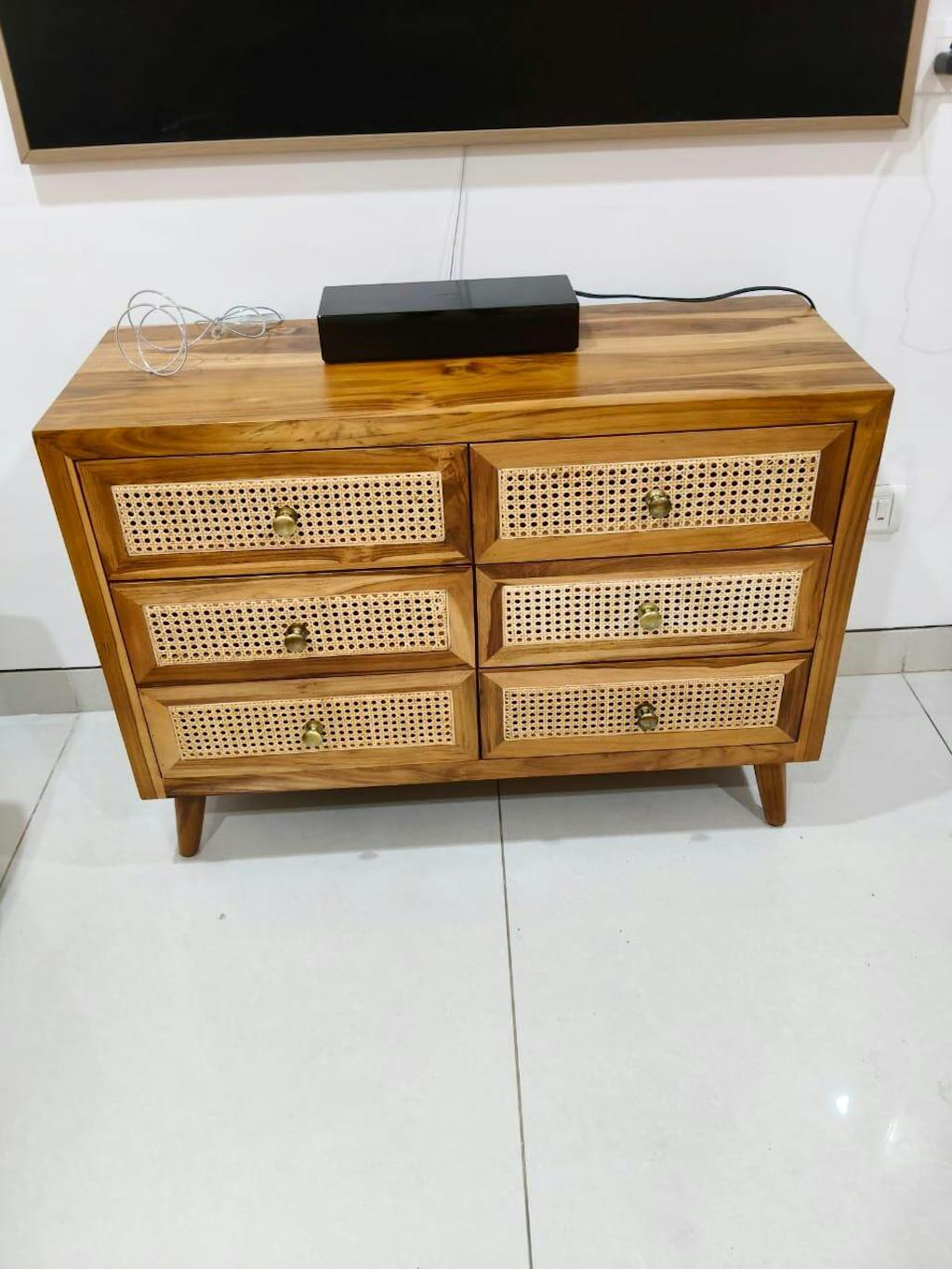 • Design : Six-drawer chest with tapered wooden legs and wooden knobs.