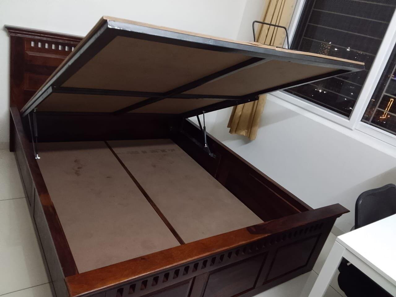 This king-size bed reflects modern luxury through its refined design and rich wooden finish. Equipped with a premium hydraulic storage system that opens smoothly to offer generous space, it perfectly combines spacious comfort, contemporary elegance, and everyday practicality.