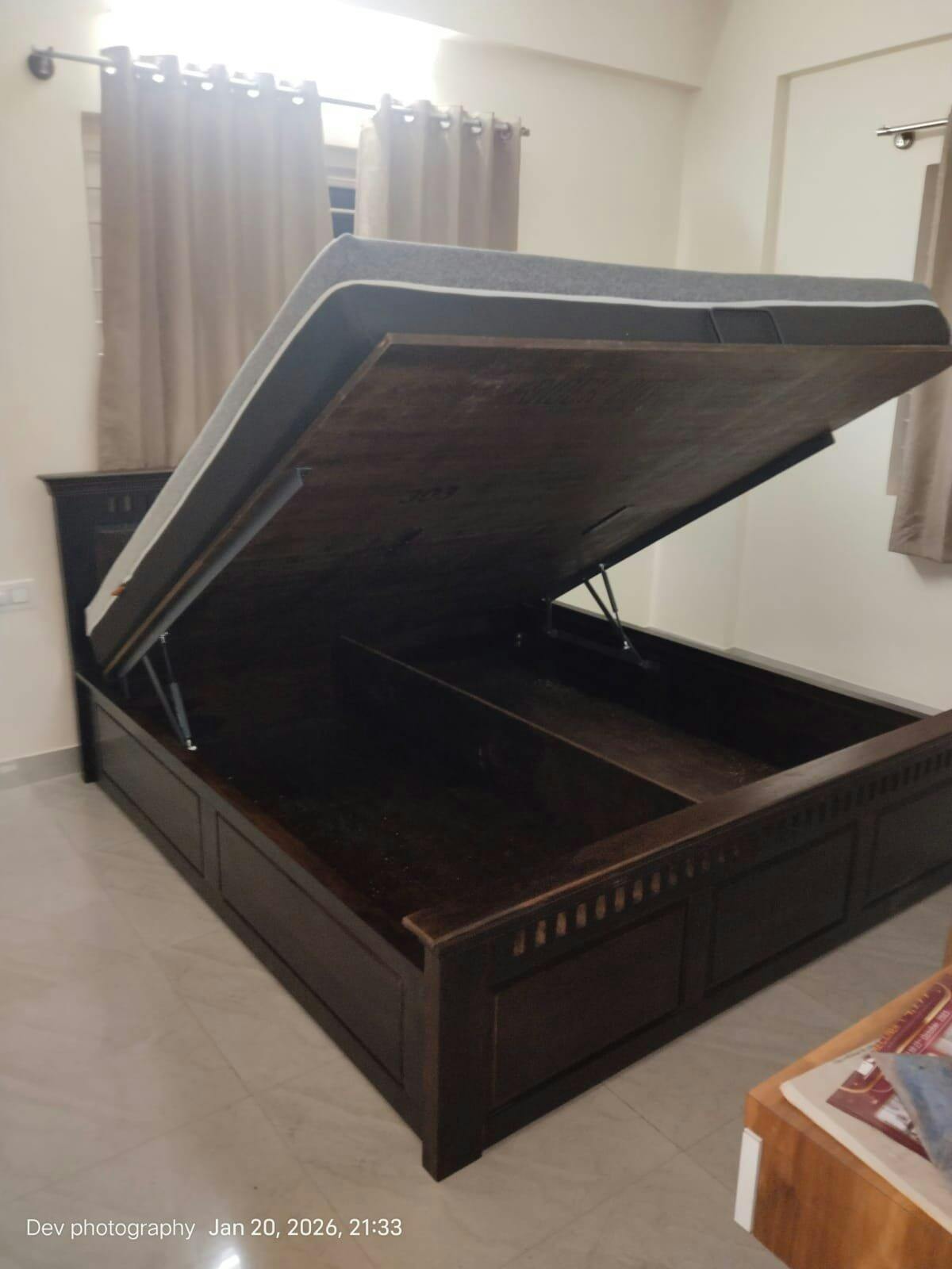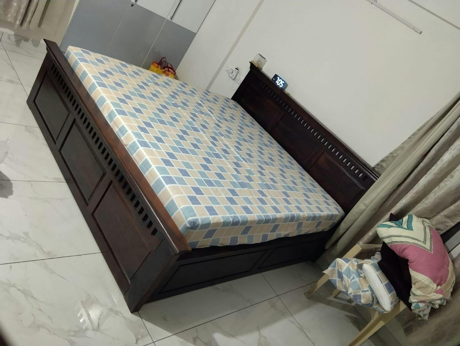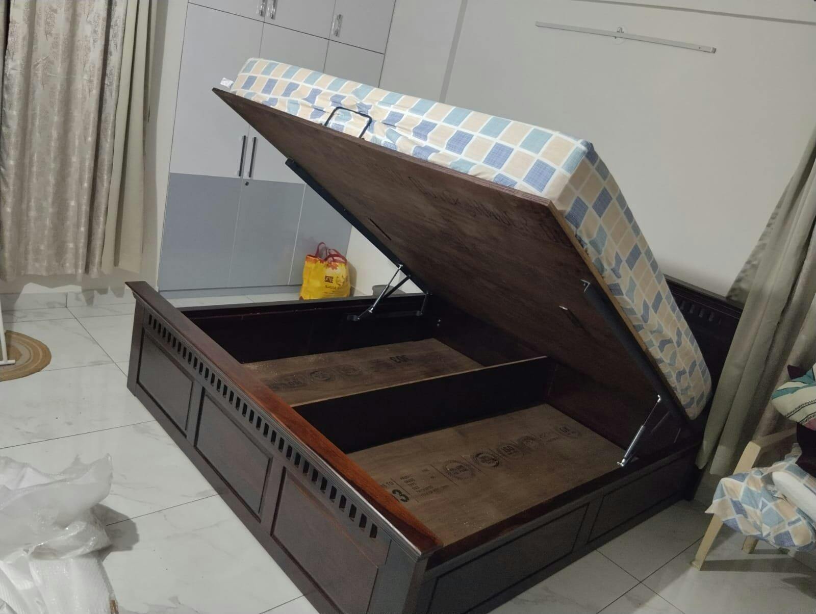 This queen-size bed combines timeless craftsmanship with modern comfort. Made from solid wood, it features a strong, durable frame, a beautifully designed headboard, and spacious hydraulic storage—ideal for those who appreciate style, strength, and everyday functionality.