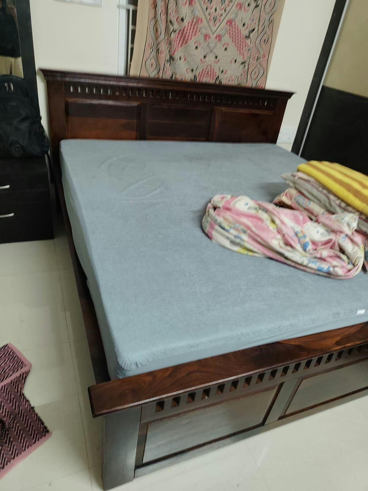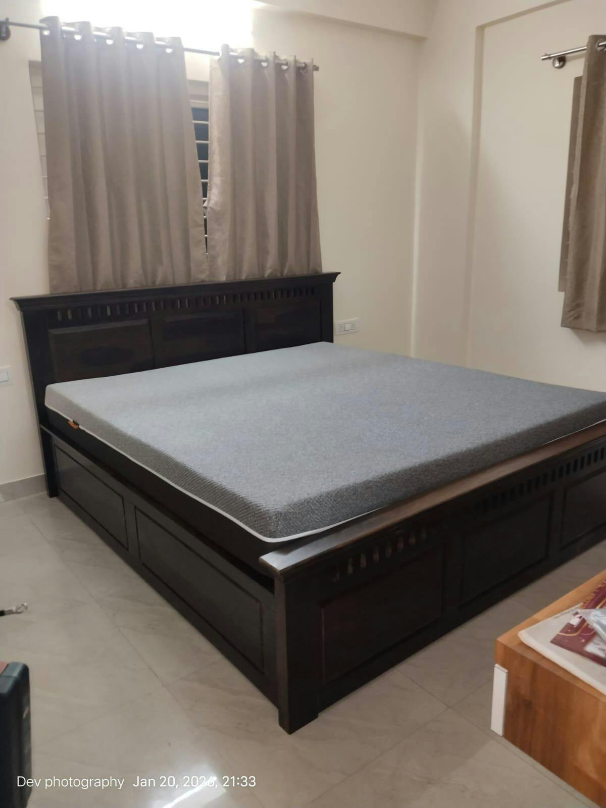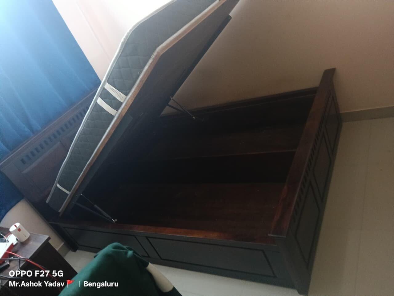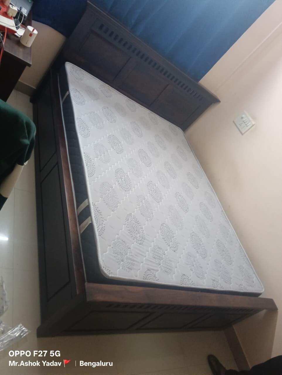 This queen-size bed combines timeless craftsmanship with modern comfort. Made from solid wood, it features a strong, durable frame, a beautifully designed headboard, and spacious hydraulic storage—ideal for those who appreciate style, strength, and everyday functionality.