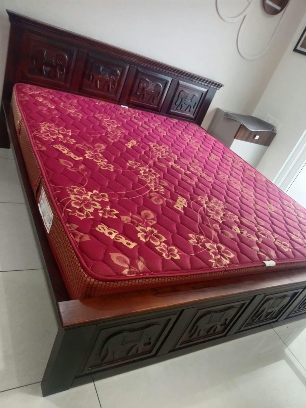 Such a beautifully crafted bed! The carved wooden headboard and footboard add a rich, traditional charm that instantly elevates the room’s decor. The combination of the elegant dark wood and the vibrant mattress creates a warm, luxurious look. Sturdy, stylish, and full of character—truly an impressive piece.