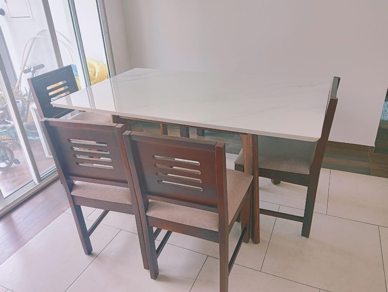 This dining set blends elegance with durability through its sturdy build and sophisticated design. Available in both compact and 6-seater options, it features a customizable marble top—an ideal choice for stylish, space-efficient modern homes.