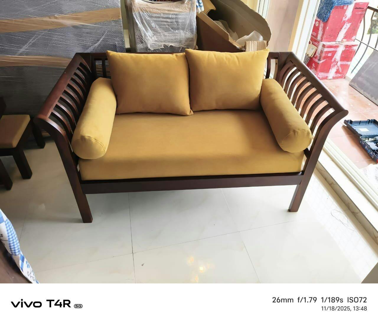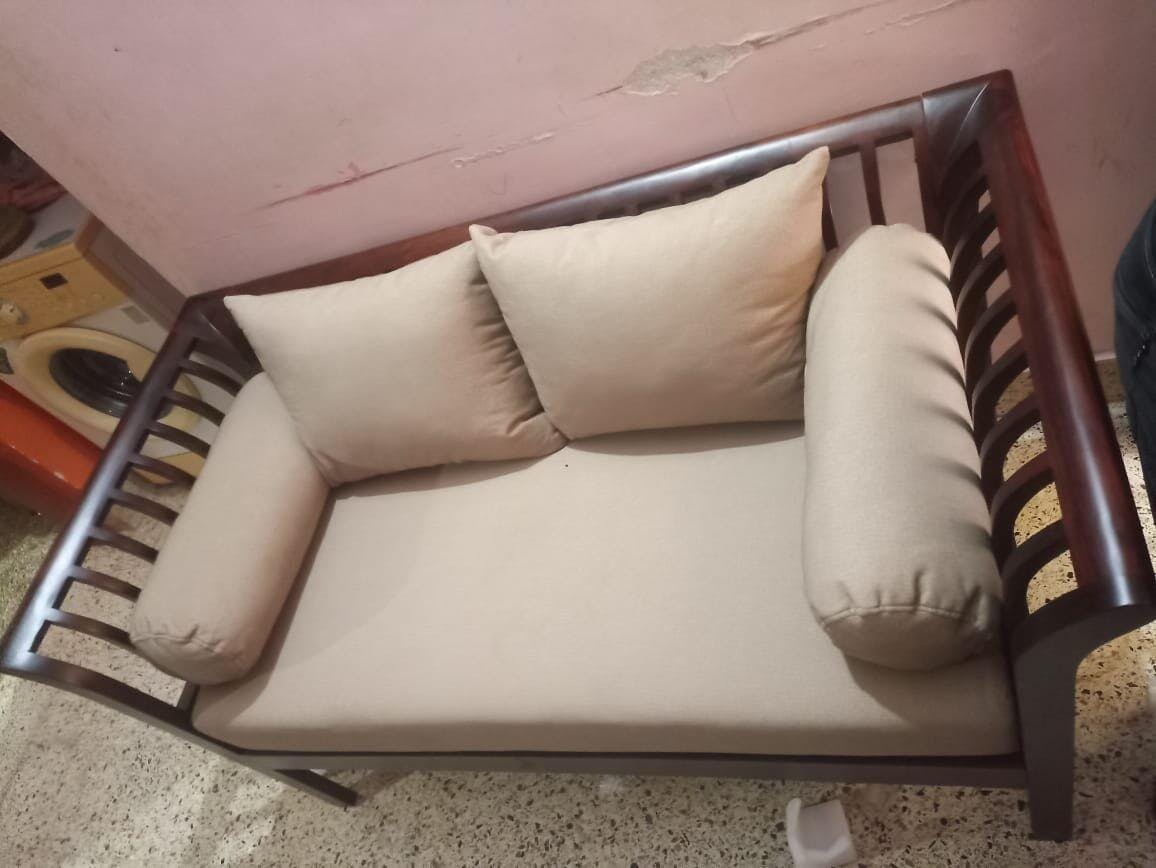 This wooden sofa is a beautiful blend of elegance and comfort, featuring a sleek frame and soft beige cushions that create a warm, inviting look. The build quality is excellent, and its smooth finish adds a refined charm to the living room.