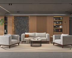 Design: Clean lines, broad armrests, straight frame, plush detachable cushions