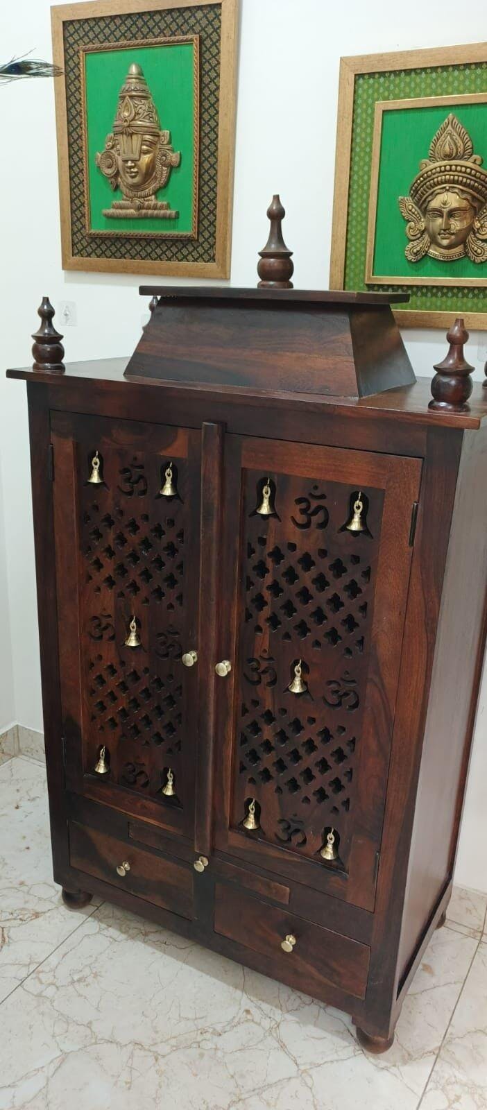 This wooden home temple is a masterpiece of fine craftsmanship, featuring intricate detailing and a luxurious finish that elevates the sacredness of any space. Its robust construction and sophisticated design create a tranquil focal point, perfect for nurturing peace and devotion in your home.