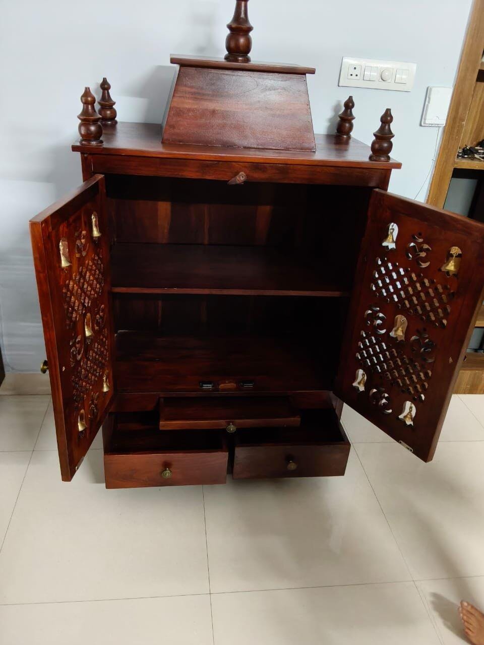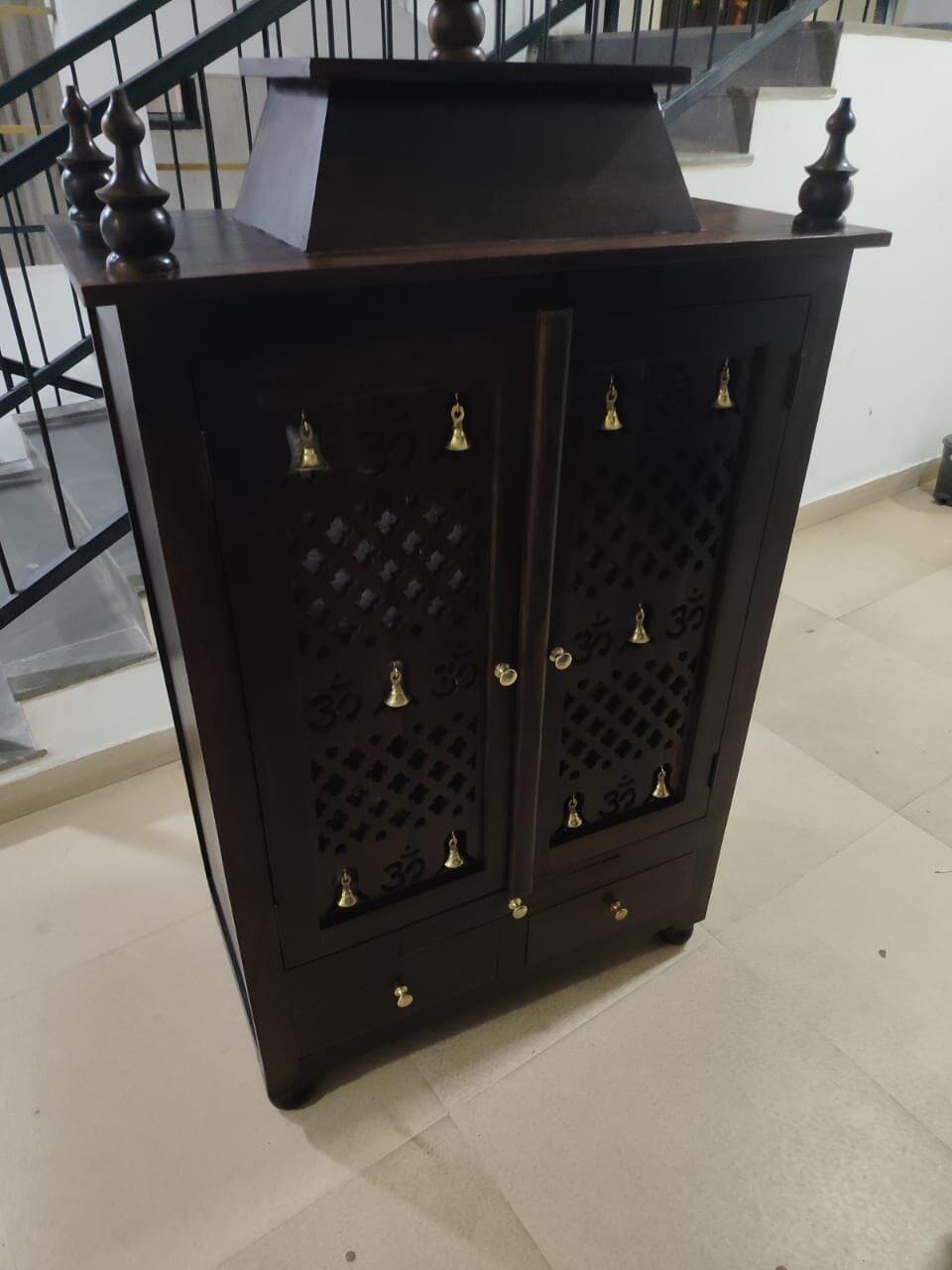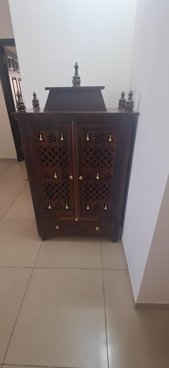This wooden home temple reflects exquisite craftsmanship, highlighted by intricate detailing and a rich, elegant finish. Designed with a sturdy structure and graceful form, it creates a serene and peaceful ambiance, making it an ideal centerpiece for devotion, harmony, and spiritual calm within your home.