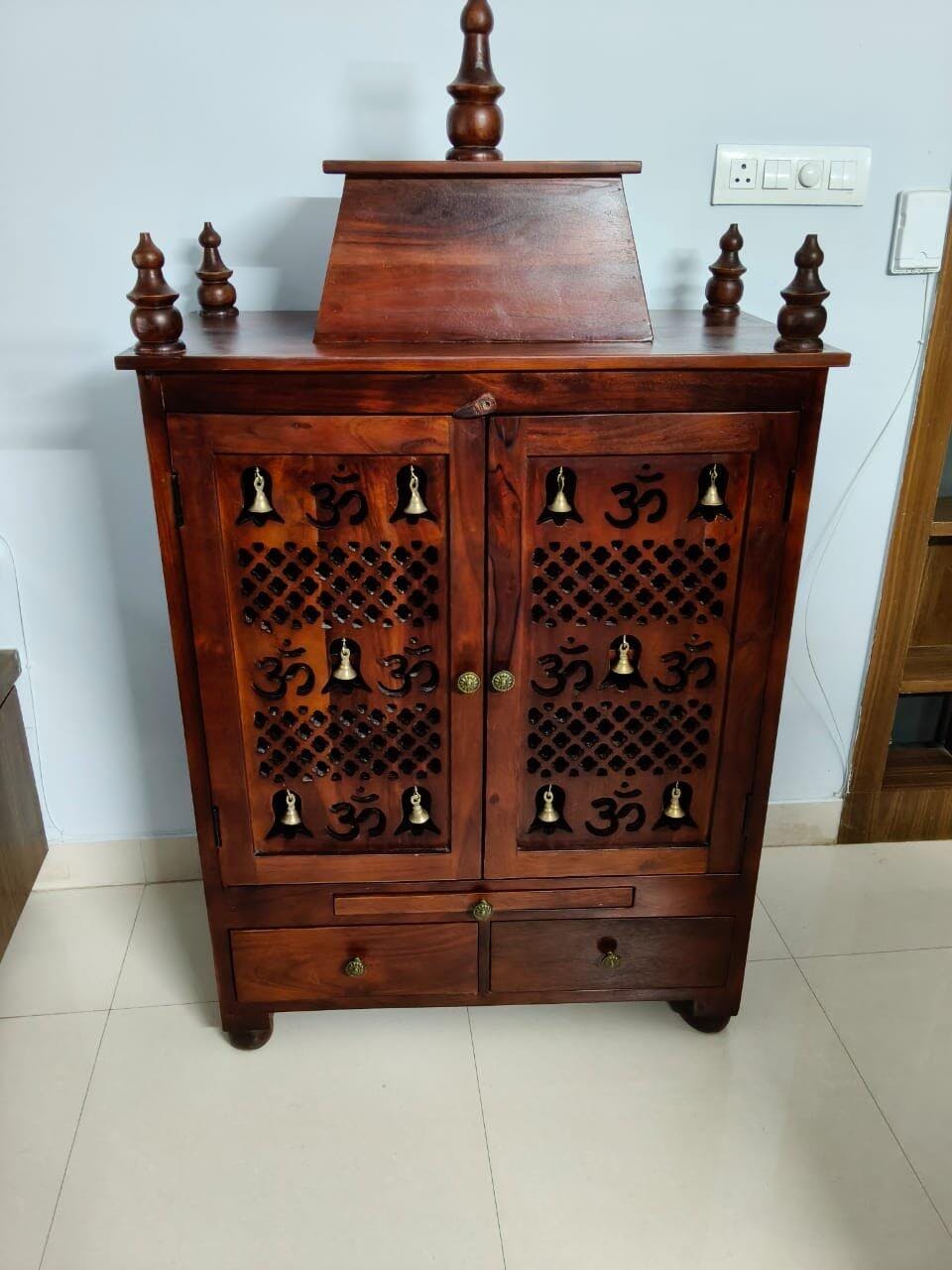 This wooden home temple showcases fine craftsmanship with intricate detailing and a rich, elegant finish. Its sturdy structure and graceful design create a calm and peaceful atmosphere, making it a perfect centerpiece for devotion, serenity, and harmony in your home.