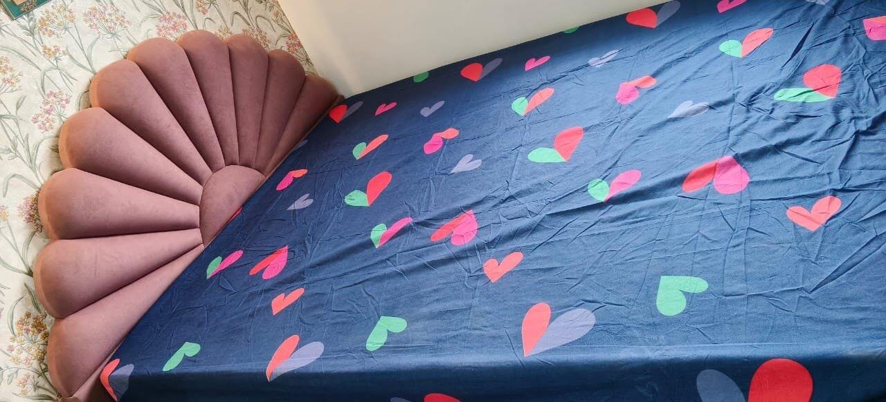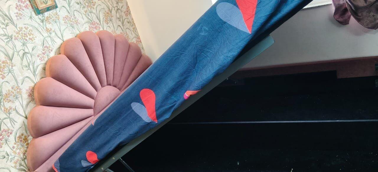 The Satin Teak Bed features a sturdy, real teak-wood frame with a plush upholstered headboard (50+ fabric options), with hydraulic storage options. Available in king and queen sizes.
