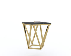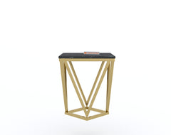 The Solaia Side Table with Black Engineered Marble Top combines modern design with practical functionality. The black engineered marble top, enhanced with seven layers of coatings for superior durability and aesthetic appeal, rests on a robust SS304 stainless steel frame coated with premium PVD. This side table represents high-quality craftsmanship and durability, making it an ideal choice for enhancing any contemporary setting.