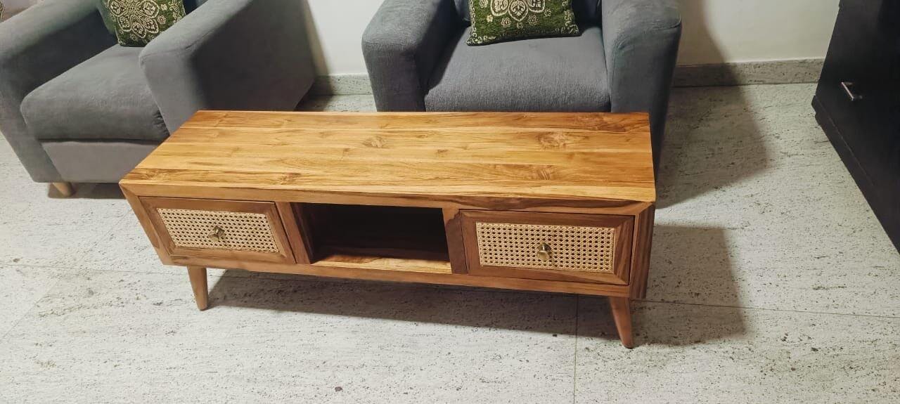 • Design : TV unit with two drawers, one open shelf, and hexagonal rattan accent.