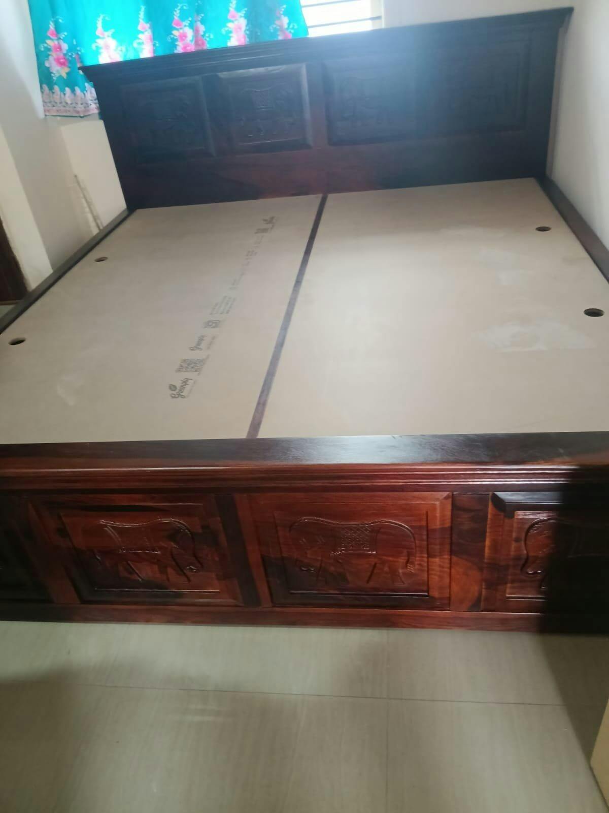 The bed looks absolutely beautiful with its rich wooden finish and stunning hand-carved elephant panels. The craftsmanship is exceptional, giving the room a classic and luxurious touch. It looks sturdy, elegant, and perfectly designed—truly a premium addition to any home.