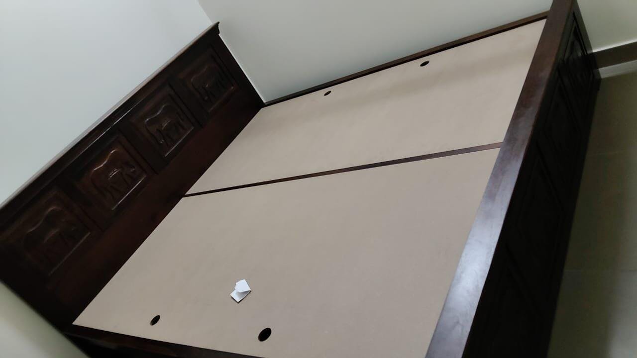 Beautifully crafted, rich wooden bed with elegant carving and Hydraulic Storage—sturdy, stylish, and smart.