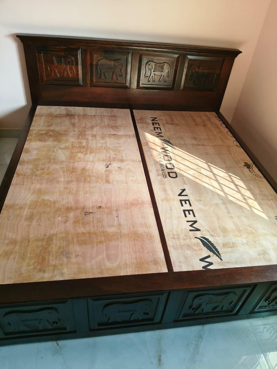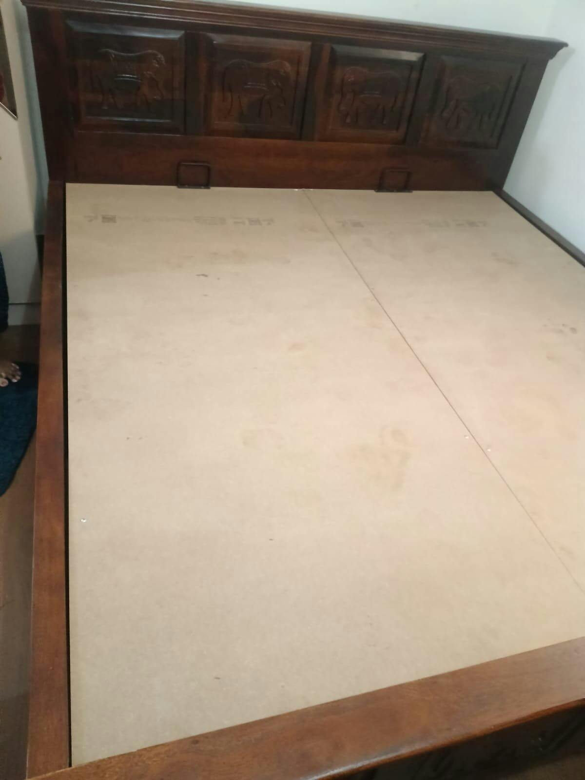 This premium wooden king-size bed in Bangalore showcases beautifully hand-carved elephant panels and a rich wooden finish, blending timeless elegance with exceptional durability. Its superior craftsmanship makes it a stunning centerpiece that brings classic charm and lasting quality to any bedroom.