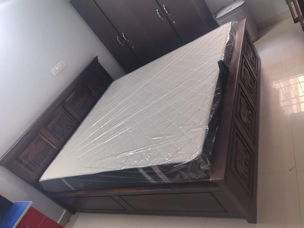 Beautifully crafted solid wood bed with elegant carved detailing on the headboard. Strong structure, premium finish, and perfect for a comfortable and stylish bedroom.