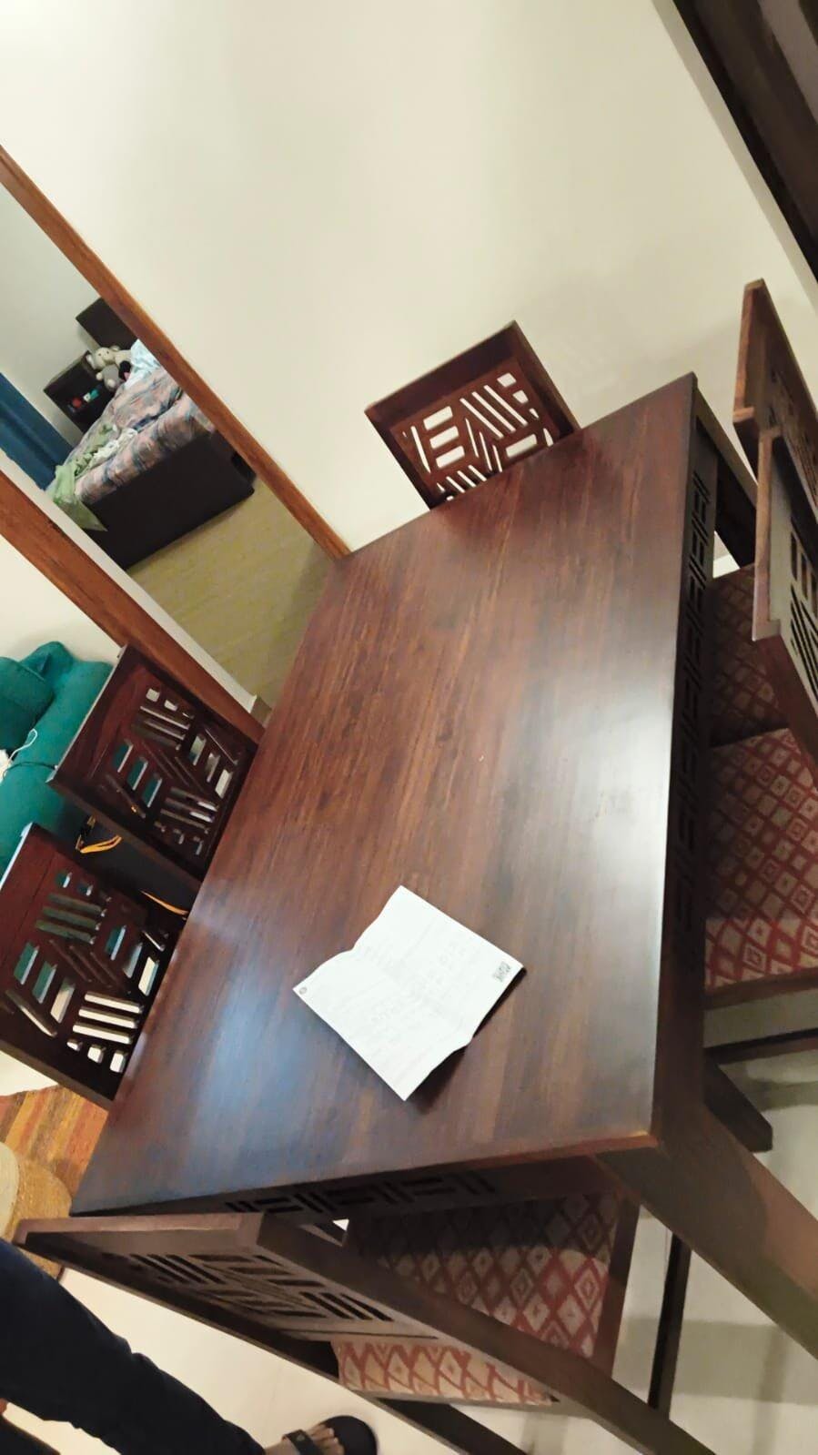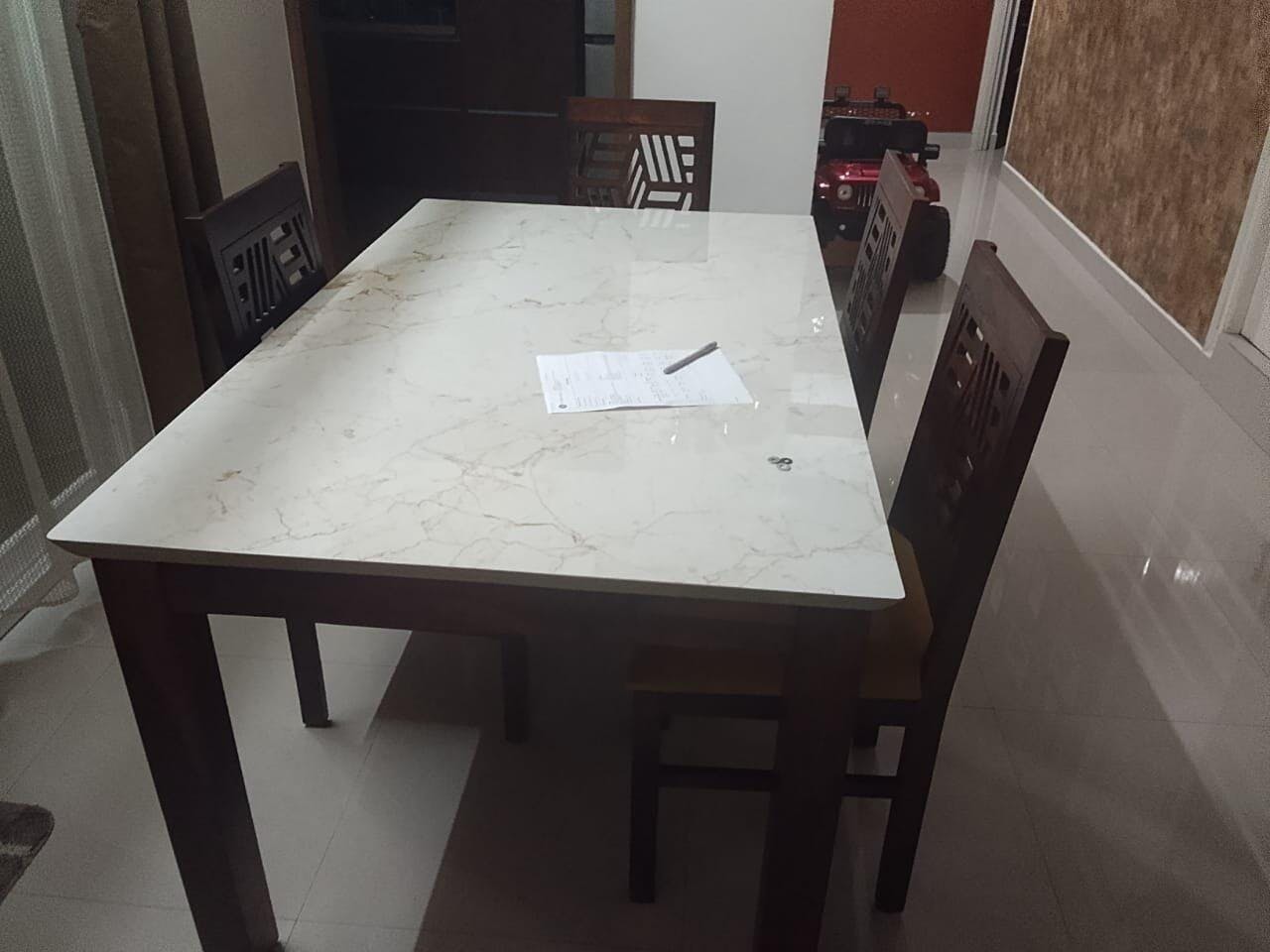 - Material : Marble stone top, powder-coated mild steel (used in automobiles) frame, upholstered chairs with electroplated mild steel (used in automobiles) legs.